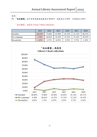 (9) 「紙本圖書」表示非常滿意與滿意者佔 96.05%,無意見佔 9.30%,不滿意佔 4.65%。