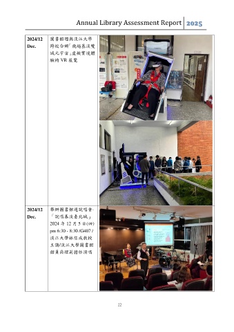 Annual Library Assessment Report 2025 2024/12 圖書館週與淡江大學 Dec. 跨校合辦「飛越基淡雙 城元宇宙」虛擬實境體 驗椅 VR 展覽 2024/12 舉辦圖書館週說唱會- Dec. 「說唱基淡臺北城」 2024 年 12 月 5 日(四) pm 6:30 - 8:30 /G407 / 淡江大學林信成教授 主講/淡江大學圖書館 館員吳理莉擔任演唱 22