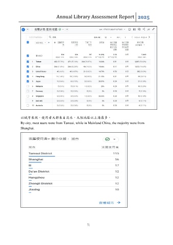 Annual Library Assessment Report 2025 以城市來說,使用者大都來自淡水,大陸地區以上海最多。 By city, most users were from Tamsui, while in Mainland China, the majority were from Shanghai. 71