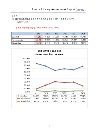 (1) 圖書館的整體服務表示非常滿意與滿意者佔 86.05%,無意見佔 9.30%,