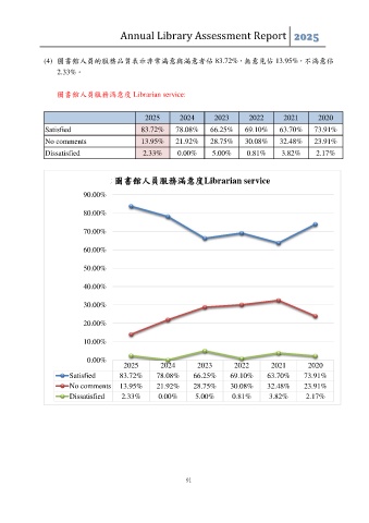 (4) 圖書館人員的服務品質表示非常滿意與滿意者佔 83.72%,無意見佔 13.95%,不滿意佔