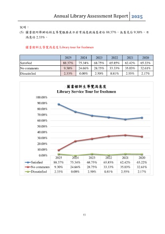 (5) 圖書館所舉辦的新生導覽服務表示非常滿意與滿意者佔 88.37%,無意見佔 9.30%,不